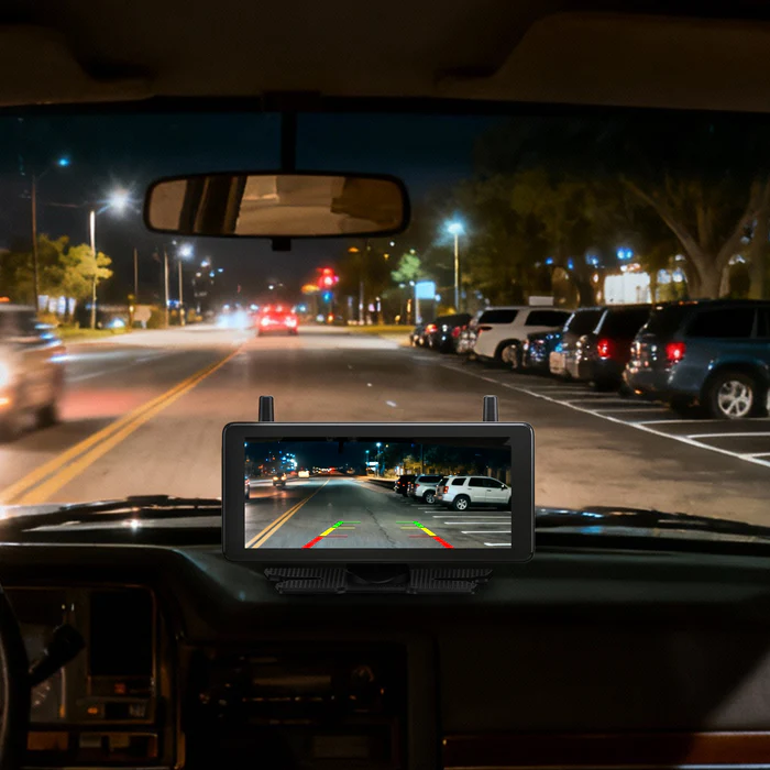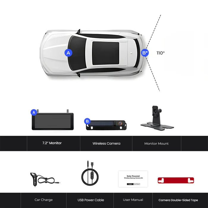 Solar1 Pro is a completely wireless backup camera designed for outdoor activities, powered by a rechargeable battery with solar power to extend battery life. It features AUTO-VOX’s patented split-type wireless lens waterproof structure, easy wire-free DIY installation, and a 5” HD monitor for safe driving and parking.