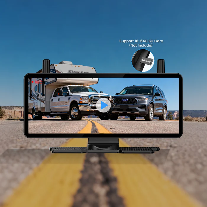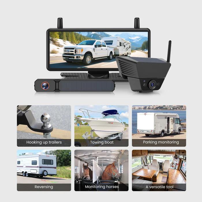 This Solar 5C wireless backup camera features a dual-camera system with magnetic and license plate mounts. Solar-powered for easy use, it moves between vehicles to provide a stable rear view for safer parking and driving.